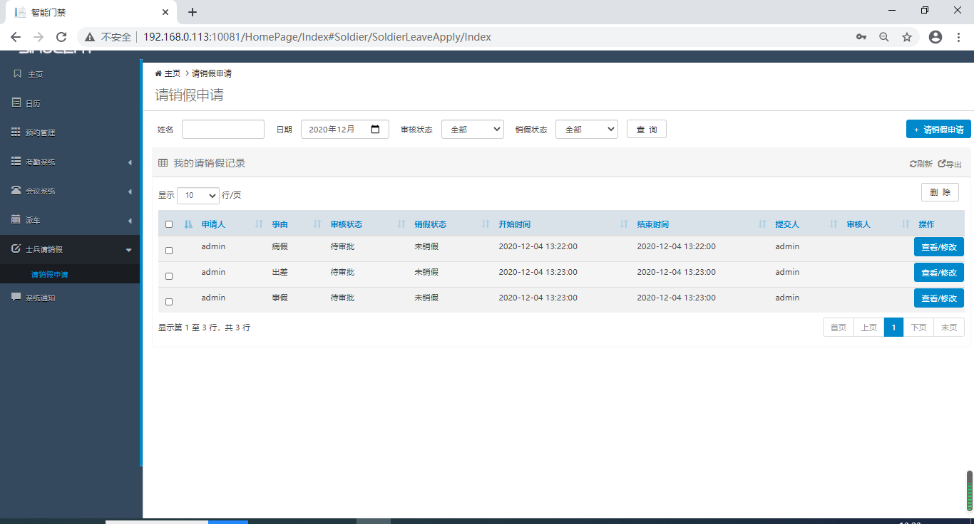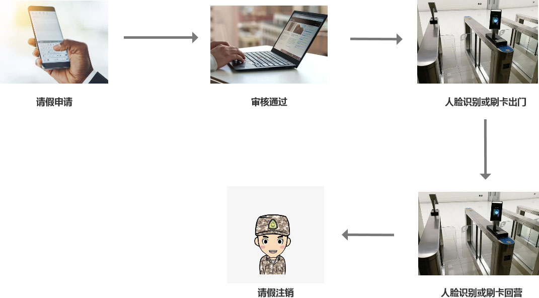 請(qǐng)銷假系統(tǒng)主要用于部隊(duì)營(yíng)區(qū), 士兵通過本系統(tǒng)提交請(qǐng)銷假申請(qǐng), 請(qǐng)銷假審核通過后,系統(tǒng)自動(dòng)授權(quán)到營(yíng)門口. 只有請(qǐng)銷假通過的士兵可以通行. 當(dāng)士兵回營(yíng)后, 系統(tǒng)自動(dòng)取消門口授權(quán).